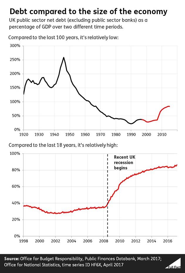 Labour was in power between 1997 and 2010, followed by the Conservatives (leading a coalition and then alone) from 2010 to 2017. The amount of money the government owes has mostly risen over those two decades, under administrations of both hues. In particular, the financial crisis and ensuing recession led to a considerable increase in debt from about 2008 onward.