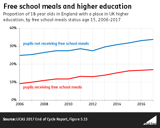 Pupils receiving free school meals at the age of 15 were half as likely to access higher education in 2017 as those who didn’t receive them. The gap had been falling over time, although it has stopped in the last two years.