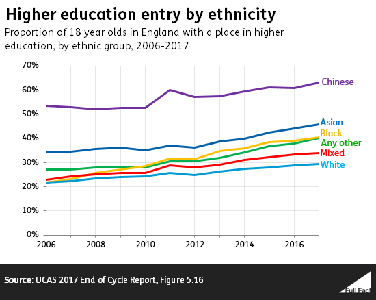 In the UK in 2016/17, 74% of UK students in their first year of an undergraduate degree were white. Among 18 year-olds in England, white pupils are the least likely of any ethnic group to take up a place in UK higher education.
