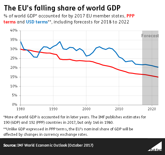 It’s also likely that estimates for earlier years over-estimate the EU’s share of world GDP as only 146 countries were accounted for in 1980, compared to 190 for GDP estimates and 192 for PPP estimates in 2017.