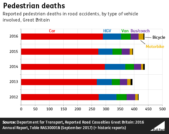 Very few pedestrian fatalities involve cyclists. Of the 448 pedestrians killed by a vehicle in 2016, three were caused by bicycles, compared to 289 by cars. These levels have been broadly consistent over the past five years.