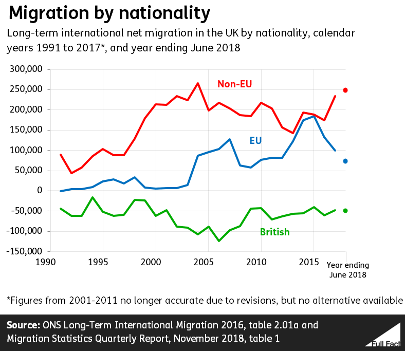 One of these ‘disagreements’ becomes apparent when comparing the previous two charts—the non-EU population of the UK isn’t growing, but the net migration of non-EU citizens is positive each year. One recent estimate suggested that, over the past eight years, around half a million non-EU nationals are unaccounted for because of this difference, and a similar discrepancy in the opposite direction applies to EU nationals.