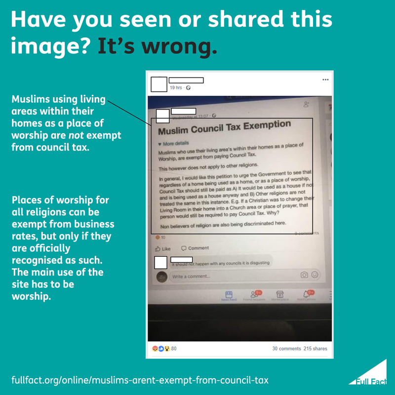 A Facebook post has claimed that Muslims who use living areas “within their homes” as a place of worship are exempt from paying council tax. The post shows a picture of a 2013 petition saying this exemption “does not apply to other religions”.