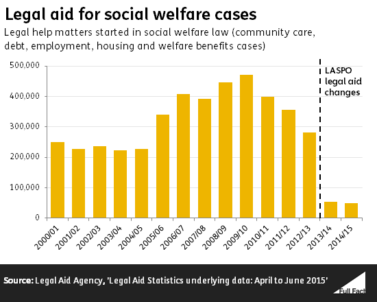 Some of these savings have come from limiting the type of cases that are eligible for legal aid funding—particularly affecting disputes about employment, debt, housing, immigration, personal injury, welfare benefits and family arrangements. The government has also tightened the financial test for receiving legal aid.